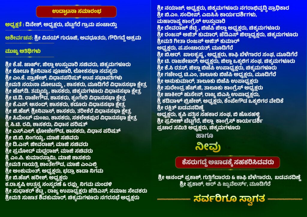 ಬೆಟ್ಟಗೆರೆ ಗ್ರಾಮ ಪಂಚಾಯಿತಿ ಅಧ್ಯಕ್ಷರಾದ ದಿನೇಶ್ ಅಧ್ಯಕ್ಷತೆಯಲ್ಲಿ ವೇದಿಕೆ ಕಾರ್ಯಕ್ರಮ ನಡೆಯಲಿದೆ. ಅವಧೂತ ಶ್ರೀ ವಿನಯ್ ಗುರೂಜಿ ಆಶೀರ್ವಚನ ನೀಡಲಿದ್ದಾರೆ. ಮುಖ್ಯ ಅತಿಥಿಗಳಾಗಿ ಜಿಲ್ಲಾ ಉಸ್ತುವಾರಿ ಸಚಿವ ಕೆ.ಜೆ. ಜಾರ್ಜ್, ಸಂಸದ ಕೋಟಾ ಶ್ರೀನಿವಾಸ ಪೂಜಾರಿ, ಎಂಎಲ್ಸಿ ಎಂ.ಕೆ. ಪ್ರಾಣೇಶ್, ಶಾಸಕರಾದ ನಯನಾ ಮೋಟಮ್ಮ, ಹೆಚ್.ಡಿ ತಮ್ಮಯ್ಯ, ಟಿ.ಡಿ. ರಾಜೇಗೌಡ, ಕೆ.ಎಸ್. ಆನಂದ್, ಜಿ.ಹೆಚ್. ಶ್ರೀನಿವಾಸ್, ಸಿಮೆಂಟ್ ಮಂಜು, ಎಂಎಲ್ಸಿಗಳಾದ ಸಿ.ಟಿ ರವಿ, ಎಸ್.ಎಲ್. ಭೋಜೇಗೌಡ, ಬಿ.ಬಿ. ನಿಂಗಯ್ಯ, ಮಾಜಿ ಸಚಿವರಾದ ಡಿ.ಎನ್. ಜೀವರಾಜ್, ಪ್ರಮೋದ್ ಮಧ್ವರಾಜ್, ಎಂ.ಪಿ. ಕುಮಾರಸ್ವಾಮಿ, ಭದ್ರಾ ಕಾಡಾ ನಿಗಮ ಅಧ್ಯಕ್ಷ ಅಂಶುಮಂತ್, ಕ.ರಾ.ಕೃಷಿ ಉತ್ಪನ್ನ ಸಂಸ್ಕರಣೆ & ರಫ್ತು ನಿಗಮ ಮಂಡಳಿ ಅಧ್ಯಕ್ಷ ಬಿ.ಹೆಚ್. ಹರೀಶ್, ಜೆಡಿಎಸ್‌ ರಾಜ್ಯ ಉಪಾಧ್ಯಕ್ಷ ಸುಧಾಕರ್ ಶೆಟ್ಟಿ, ಚಿಕ್ಕಮಗಳೂರು ನಗರಸಭೆ ಅಧ್ಯಕ್ಷೆ ಸುಜಾತ ಶಿವಕುಮಾರ್, ಚಿಕ್ಕಮಗಳೂರು ನಯಾಜ್, ಎಐಸಿಸಿ ಕಾರ್ಯದರ್ಶಿ ಬಿ.ಎಂ. ಸಂದೀಪ್, ಬಿಜೆಪಿ ಜಿಲ್ಲಾಧ್ಯಕ್ಷ ದೇವರಾಜ್ ಶೆಟ್ಟಿ, ಜೆಡಿಎಸ್‌ ಜಿಲ್ಲಾಧ್ಯಕ್ಷ ರಂಜನ್ ಅಜಿತ್ ಕುಮಾರ್​, ಮೂಡಿಗೆರೆ ಪಟ್ಟಣ ಪಂಚಾಯಿತಿ ಅಧ್ಯಕ್ಷೆ ಶ್ರೀಮತಿ ಗೀತಾ ರಂಜನ್ ಅಜಿತ್ ಕುಮಾರ್, ಮೂಡಿಗೆರೆ ಕಾಫಿ ಬೆಳೆಗಾರರ ಸಂಘದ ಅಧ್ಯಕ್ಷ ಬಿ.ಆರ್. ಬಾಲಕೃಷ್ಣ, ಜಿಲ್ಲಾ ಬಿಜೆಪಿ ಉಪಾಧ್ಯಕ್ಷ ಕೆ.ಸಿ. ರತನ್, ತಾಲೂಕು ಬಿಜೆಪಿ ಅಧ್ಯಕ್ಷ ಗಜೇಂದ್ರ ಟಿ.ಎಂ., ತಾಲೂಕು ಬಿಜೆಪಿ ಉಪಾಧ್ಯಕ್ಷ ಅನುಕುಮಾರ್​, ತಾಲೂಕು ಕಾಂಗ್ರೆಸ್‌ ಅಧ್ಯಕ್ಷ ಸುರೇಂದ್ರ ಹೆಚ್.ಜಿ, ರಾಜ್ಯ ಬಿಎಸ್ಪಿ ಉಪಾಧ್ಯಕ್ಷ ಜಾಕೀರ್ ಹುಸೇನ್, ಕೆಂಪೇಗೌಡ ಒಕ್ಕಲಿಗರ ವೇದಿಕೆ ಅಧ್ಯಕ್ಷ ಕಡಿದಾಳ್ ಬ್ರಿಜೇಶ್, ಕೃಷಿ ಪತ್ತಿನ ಸಹಕಾರ ಸಂಘ ಅಧ್ಯಕ್ಷ ರಕ್ಷಿತ್ ಬಡವನದಿಣ್ಣೆ, ಜಿಲ್ಲಾ ಕಾಂಗ್ರೆಸ್‌ ಪ್ರಚಾರ ಸಮಿತಿ ಅಧ್ಯಕ್ಷ ಪ್ರವೀಣ್ ಬೆಟ್ಟಗೆರೆ, ಚಿತ್ರ ನಿರ್ಮಾಪಕ ರವಿ ರೈ, ಕಾಫಿ ಬೆಳೆಗಾರರು ಆನಂದ್ ಪ್ರಕಾಶ್, ಆರ್‌.ಪಿ. ಜ್ಯುವೆಲ್ಲರ್ಸ್‌ ಪ್ರಕಾಶ್‌, ಜಿಲ್ಲಾ ಕಾರ್ಯನಿರತ ಪತ್ರಕರ್ತರ ಸಂಘ ಅಧ್ಯಕ್ಷ ಕೆ.ಹೆ.ಚ್.‌ ವೇಣುಕುಮಾರ್‌, ಖ್ಯಾತ ವಕೀಲ, ಬಿಜೆಪಿ ಮುಖಂಡ ದೇವರಾಜೇಗೌಡ, ಖ್ಯಾತ ವಕೀಲರು, ಕಾಂಗ್ರೆಸ್‌ ಮುಖಂಡ ಸುಧೀರ್‌ ಕುಮಾರ್‌ ಮುರೊಳ್ಳಿ ಮುಂತಾದವರಿರಲಿದ್ದಾರೆ.