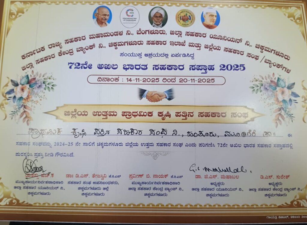 ಮೂಡಿಗೆರೆ: ಹಂತೂರು ಪ್ರಾಥಮಿಕ ಕೃಷಿ ಪತ್ತಿನ ಸಹಕಾರ ಸಂಘಕ್ಕೆ ಉತ್ತಮ ಸಹಕಾರ ಸಂಘ ಪ್ರಶಸ್ತಿ
