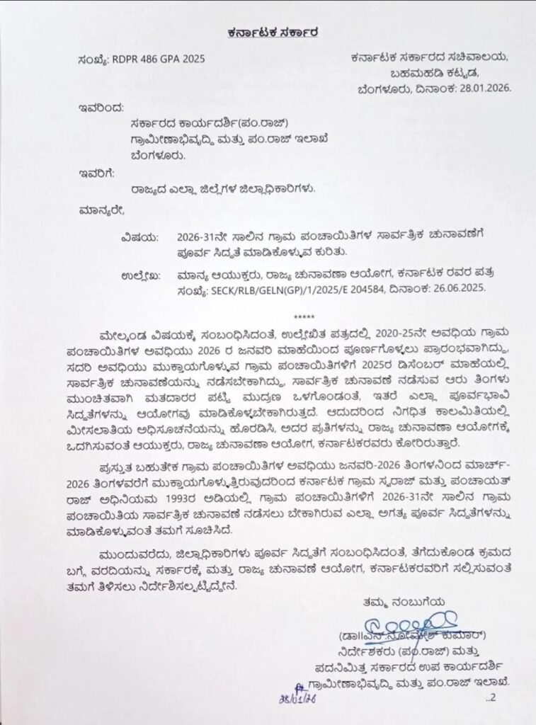 ಬಹುತೇಕ ಗ್ರಾಮ ಪಂಚಾಯಿತಿಗಳ ಮಾರ್ಚ್‌-2026 ರ ವೇಳೆಗೆ ಮುಕ್ತಾಯ  ಆಗುತ್ತಿದ್ದು  2026-31ನೇ ಸಾಲಿನ ಗ್ರಾಮ ಪಂಚಾಯಿತಿಯ ಸಾರ್ವತ್ರಿಕ ಚುನಾವಣೆ ನಡೆಸಲು ಬೇಕಾಗಿರುವ ಎಲ್ಲಾ ಅಗತ್ಯ ಪೂರ್ವ ಸಿದ್ಧತೆಗಳನ್ನು ಮಾಡಿಕೊಳ್ಳುವಂತೆ ಜಿಲ್ಲಾಧಿಕಾರಿಗಳಿಗೆ ಇಲಾಖೆ ಸೂಚಿಸಿದೆ.