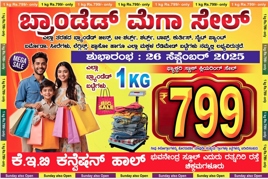 ಚಿಕ್ಕಮಗಳೂರು: ದಸರಾ ಹಬ್ಬದ ಪ್ರಯುಕ್ತ ಬ್ರ್ಯಾಂಡೆಡ್ ಮೆಗಾ ಸೇಲ್‌ ಆರಂಭಗೊಂಡಿದ್ದು ಎಲ್ಲಾ ತರಹದ ಬ್ರ್ಯಾಂಡೆಡ್ ‌ ಬಟ್ಟೆಗಳು ಇಲ್ಲಿ ಸಿಗುತ್ತವೆ ಈಗಲೇ ಭೇಟಿ ಕೊಟ್ಟು ನಿಮಗೆ ಬೇಕಾಗಿರುವ ಬಟ್ಟೆಗಳನ್ನ ಖರೀದಿಸಿಕೊಳ್ಳಿ.