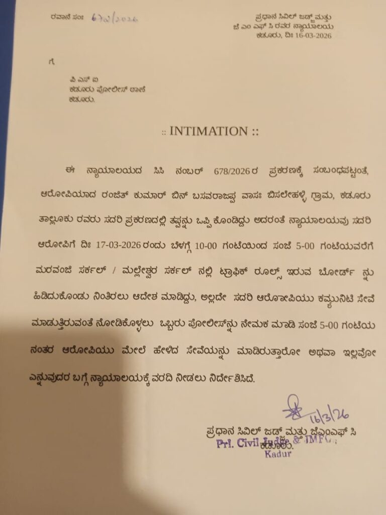ಇಂದು (ಮಾ.17) ಬೆಳಗ್ಗೆ 10 ರಿಂದ ಸಂಜೆ 5ರವರೆಗೆ ಕಡೂರು ಪಟ್ಣಣದ ಮಲ್ಲೇಶ್ವರ ಸರ್ಕಲ್ನಲ್ಲಿ ರಸ್ತೆ ಮಧ್ಯೆ ಬೋರ್ಡ್ ಹಿಡಿದು ನಿಲ್ಲುವಂತೆ ಆದೇಶಿಸಿದೆ. ಕೋರ್ಟ್ ಆದೇಶದಂತೆ ಕೈಯಲ್ಲಿ ಬೋರ್ಡ್ ಹಿಡಿದು ನಿಂತ ತಪ್ಪಿತಸ್ಥನನ್ನು ನಿಲ್ಲುತ್ತಾನೋ? ಇಲ್ವೋ? ಎಂದು ಗಮನಿಸಲು ಓರ್ವ ಪೊಲೀಸ್ ಸಿಬ್ಬಂದಿಯನ್ನು ನೇಮಿಸುವಂತೆ ನ್ಯಾಯಾಲಯ ಸೂಚಿಸಿತ್ತು. ಈ ದಿನದ ಶಿಕ್ಷೆ ಪೂರ್ಣಗೊಂಡ ನಂತರ ಪೊಲೀಸರು ಕೋರ್ಟ್ಗೆ ವರದಿ ಸಲ್ಲಿಸುವಂತೆ ಕೋರ್ಟ್ ಆದೇಶದಲ್ಲಿ ತಿಳಿಸಿತ್ತು.