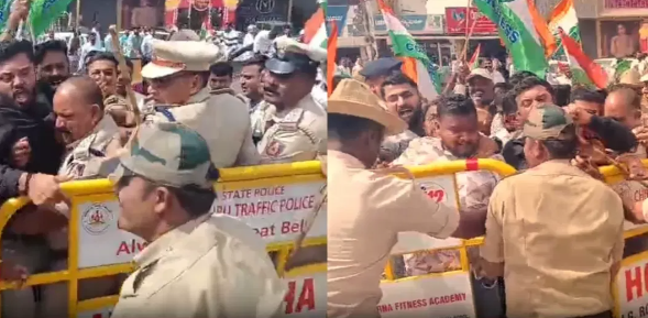 ನಗರದ ಸೇಂಟ್ ಜೋಸೆಫ್ ಚರ್ಚ್ ಬಳಿ ಕಾಂಗ್ರೆಸ್ ಕಾರ್ಯಕರ್ತರ ಪ್ರತಿಭಟನಾ ಮೆರವಣಿಗೆಯನ್ನು ಪೊಲೀಸರು ತಡೆದಾಗ ಕಾಂಗ್ರೆಸ್ ಕಾರ್ಯಕರ್ತರು ಮತ್ತು ಪೊಲೀಸರ ನಡುವೆ ತಳ್ಳಾಟ ನಡೆಯಿತು ಈ ವೇಳೆ ಕಾಂಗ್ರೆಸ್ ಕಾರ್ಯಕರ್ತರು ಬ್ಯಾರಿಕೇಡ್ ಗಳನ್ನು ತಳ್ಳಿ ಬಿಜೆಪಿ ಕಚೇರಿಗೆ ನುಗ್ಗಲು ಪ್ರಯತ್ನಿಸಿದರು.