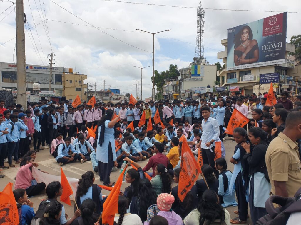ಈ ವೇಳೆ ನೂರಾರು ವಿದ್ಯಾರ್ಥಿಗಳು ಪ್ರತಿಭಟನೆಯಲ್ಲಿ ಪಾಲ್ಗೊಂಡಿದ್ದರು.