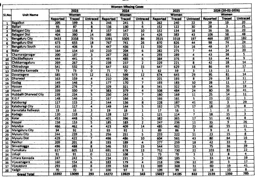 ಈವರೆಗೂ 3 ವರ್ಷದಲ್ಲಿ 823 ಮಹಿಳೆಯರು ನಾಪತ್ತೆಯಾಗಿದ್ದು ಅದರಲ್ಲಿ 794 ಪ್ರಕರಣ ಪತ್ತೆಯಾಗಿದೆ ಹಾಗೆ 29 ಮಹಿಳೆಯರು ಇನ್ನೂ ಮಿಸ್ಸಿಂಗ್ ಆಗಿದ್ದು ಈ ಬಗ್ಗೆ ಇನ್ನೂ ಪೊಲೀಸರು ಹುಡುಕಾಟದಲ್ಲೇ ಇದ್ದರೆ ಎಂದು ಹೇಳಬಹುದು.ಹಾಗೆ 3 ವರ್ಷದಲ್ಲಿ 188 ಹೆಣ್ಣು ಮಕ್ಕಳು ಮಿಸ್ಸಿಂಗ್ ಆಗಿದ್ದು 167 ಪ್ರಕರಣ ಪತ್ತೆಯಾಗಿದೆ ಇನ್ನು 21 ಹೆಣ್ಣುಮಕ್ಕಳು (ಬಾಲಕಿಯರು) ನಾಪತ್ತೆಯಾಗಿದ್ದು ಈ ಹೆಣ್ಣು ಮಕ್ಕಳು ಎಲ್ಲಿದ್ದಾರೆ ಎಂಬವುದು ಇನ್ನೂ ಪತ್ತೆಯಾಗಿಲ್ಲ. ಮಹಿಳಾ ದೌರ್ಜನ್ಯ  ಹೆಚ್ಚುತ್ತಿರುವ ಸಂದರ್ಭದಲ್ಲಿ ಈ ಪ್ರಕರಣಗಳು ನಿಜಕ್ಕೂ ಆತಂಕಕ್ಕೆ ಕಾರಣವಾಗಿದೆ.