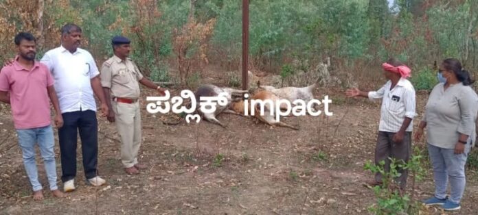 ಹೌದು .. ಹಳೆಯ ಕಬ್ಬಿಣದ ವಿದ್ಯುತ್ ಕಂಬದ ವಿದ್ಯುತ್ ಸ್ಪರ್ಶಕ್ಕೆ ಸಿಲುಕಿ, ಮೇಯಲು ತೆರಳಿದ್ದ ನಾಲ್ಕು ಹಸುಗಳು ಸ್ಥಳದಲ್ಲೇ ಸಾವನ್ನಪ್ಪಿವೆ.ಗ್ರಾಮದ ರೈತ ಚೆನ್ನಪ್ಪ ಎಂಬುವರಿಗೆ ಸೇರಿದ ಈ ಹಸುಗಳು ಎಂದಿನಂತೆ ಮೇವು ಅರಸಿ ತೆರಳಿದ್ದಾಗ ಈ ಘಟನೆ ಸಂಭವಿಸಿದೆ. ಕಷ್ಟಪಟ್ಟು ಸಾಕಿದ ಹಸುಗಳು ಪ್ರಾಣಬಿಟ್ಟಿರುವುದನ್ನು ಕಂಡ ರೈತ ಚನ್ನಪ್ಪ ಕಂಗಾಲಾಗಿದ್ದು, ತಮ್ಮ ಜೀವನೋಪಾಯಕ್ಕೆ ಆಸರೆಯಾಗಿದ್ದ ಜಾನುವಾರುಗಳನ್ನು ಕಳೆದುಕೊಂಡು ಕಣ್ಣೀರು ಹಾಕಿದ್ದಾರೆ.
