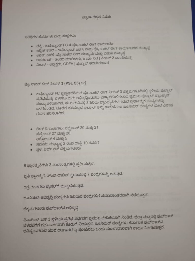 ಇದು ಸೆಪ್ಟೆಂಬರ್ 20, 21, 27 ,28 ಹಾಗೂ ಅಕ್ಟೋಬರ್ 4 ಮತ್ತು 5 ರಂದು ಮಧ್ಯಾಹ್ನ 2ರಿಂದ ರಾತ್ರಿ 10 ಗಂಟೆವರೆಗೂ ಚಿಕ್ಕಮಗಳೂರಿನ ಟರ್ಫ್ ಕ್ಲಬ್ ನಲ್ಲಿ ಪ್ರೊ ಸಾಕರ್ ಲೀಗ್ ಸೀಸನ್ - 3 ನಡೆಯಲಿದೆ ಎಂದು ತಿಳಿಸಿದರು.