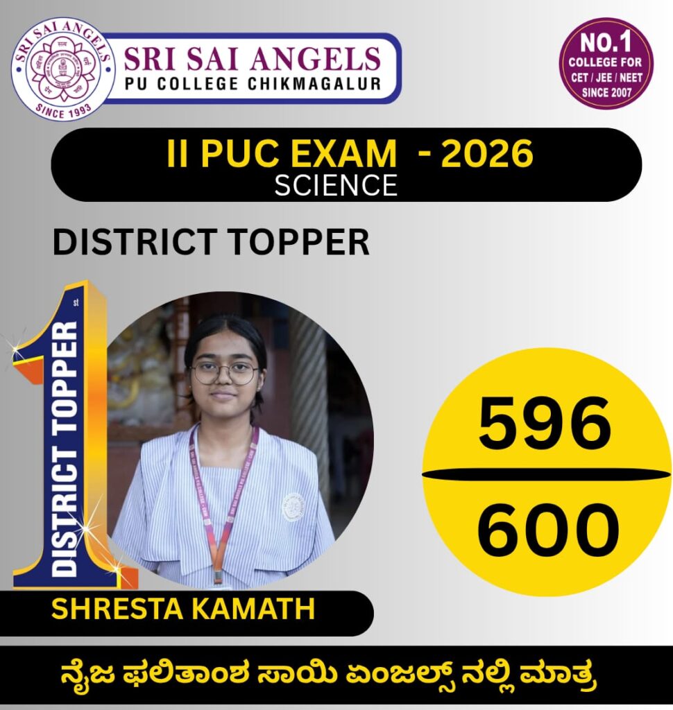 2025-26ನೇ ಸಾಲಿನ ದ್ವಿತೀಯ ಪಿಯುಸಿ ಫಲಿತಾಂಶವು ಪ್ರಕಟಗೊಂಡಿದ್ದು ಚಿಕ್ಕಮಗಳೂರಿನ ಸಾಯಿ ಏಂಜಲ್ಸ್ ಪದವಿ ಪೂರ್ವ ಕಾಲೇಜು ವಿಜ್ಞಾನ ವಿಭಾಗದ ವಿದ್ಯಾರ್ಥಿಗಳು ಅದ್ಭುತ ಸಾಧನೆ ಮಾಡಿ ಜಿಲ್ಲೆಗೆ ಪ್ರಥಮ ಸ್ಥಾನ ಪಡೆದುಕೊಂಡಿದ್ದಾರೆ.