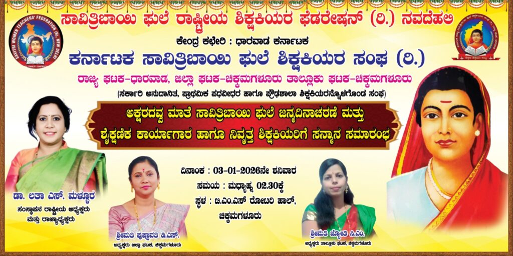 ಈ ಕಾರ್ಯಕ್ರಮದ ಕುರಿತು ಶ್ರೀಮತಿ ಪುಷ್ಪಾವತಿ ಅಧ್ಯಕ್ಷರು ಮತ್ತು ಸದಸ್ಯರು ಸಾವಿತ್ರಿಬಾಯಿ ಫುಲೆ ಶಿಕ್ಷಕಿಯರ ಸಂಘದ ಜಿಲ್ಲಾ ಘಟಕದಿಂದ ಆಹ್ವಾನಿಸಲಾಗಿದೆ.