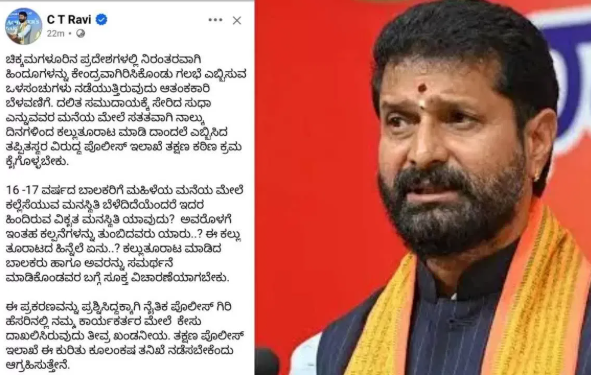 ದಲಿತ ಮಹಿಳೆ ಸುಧಾ ಎನ್ನುವರ ಮನೆ ಮೇಲೆ ಕಲ್ಲು ಎಸೆತಕ್ಕೆ ಆಕ್ರೋಶ ವ್ಯಕ್ತ ಪಡಿಸಿದ್ದು ಅಪ್ರಾಪ್ತ ಬಾಲಕರಿಗೆ ಕಲ್ಲು ಎಸೆಯುವ ವಿಕೃತ ಮನಸ್ಥಿತಿ ಅಪ್ರಾಪ್ತ ಬಾಲಕರಿಗೆ ಇಂತಹ ಕಲ್ಪನೆಗಳು, ಹೋರಾಟದ ಹಿನ್ನೆಲೆ ಏನು ಇದನ್ನು ಸಮರ್ಥನೆ ಮಾಡಿಕೊಂಡವರ ಸೂಕ್ತ ವಿಚಾರಣೆ ಮಾಡಬೇಕು ಹಾಗೆ ನೈತಿಕ ಪೊಲೀಸ್ ಗಿರಿ ಹೆಸರಿನಲ್ಲಿ ಬಿಜೆಪಿ ಕಾರ್ಯಕರ್ತರ ಮೇಲೆ ಕೇಸ್ ದಾಖಲಿಸಿರುವುದನ್ನು ಸಿ.ಟಿ.ರವಿ ಅವರು ಕಟುವಾಗಿ ಟೀಕಿಸಿದ್ದಾರೆ.