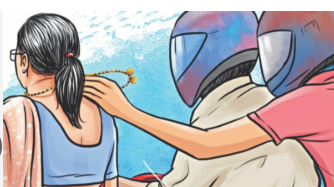 ನಂತರ ಅಲ್ಲಿಂದ ಅವರು ಸ್ಕೂಟಿಯಲ್ಲಿ ಮುಂದೆ ಹೋದಂತೆ ಮಾಡಿ ಪುನಃ ಸ್ಕೂಟಿಯನ್ನು ಹಿಂದಕ್ಕೆ ತಿರುಗಿಸಿಕೊಂಡು ಬಂದಿದ್ದು ನಾನು ಎದ್ದು, ಹೊರಟು ನಿಂತಿದ್ದಾಗ ನನ್ನನ್ನು ಅಡ್ಡಗಟ್ಟಿ ತಡೆದು ಏಕಾಏಕಿಯಾಗಿ ಸ್ಕೂಟಿಯ ಹಿಂದೆ ಕುಳಿತಿದ್ದ ಅಪರಿಚಿತ ವ್ಯಕ್ತಿಯು ನನ್ನ ಕೊರಳಿಗೆ ಕೈ ಹಾಕಿ ಕೊರಳಿನಲ್ಲಿದ್ದ ಸುಮಾರು 45 ಗ್ರಾಂ ತೂಕದ ಚಿನ್ನದ ಮಾಂಗಲ್ಯದ ಸರವನ್ನು ಕಿತ್ತುಕೊಂಡಾಗ ಕೂಡಲೆ ನಾನು ಜೋರಾಗಿ ಕಿರುಚಿಕೊಳ್ಳುತ್ತಿದ್ದಂತೆ ಕಿರುಚಾಡಿದರೆ ನಿನ್ನನ್ನು ಕೊಲ್ಲದೆ ಬಿಡುವುದಿಲ್ಲ ಎಂದು ನನಗೆ ಜೀವ ಬೆದರಿಕೆ ಹಾಕಿ ನನ್ನ ಕುತ್ತಿಗೆ ಹಿಡಿದು ಸೇತುವೆ ಮೇಲೆ ತಳ್ಳಿ ಅಲ್ಲಿಂದ ಹೊರಟು ಹೋಗಿರುತ್ತಾರೆ. ಜೊರಾಗಿ ತಳ್ಳಿದ ಪರಿಣಾಮ ನನ್ನ ಬಲ ಮೊಣಕೈಗೆ ರಕ್ತಗಾಯಗಳಾಗಿರುತ್ತದೆ.