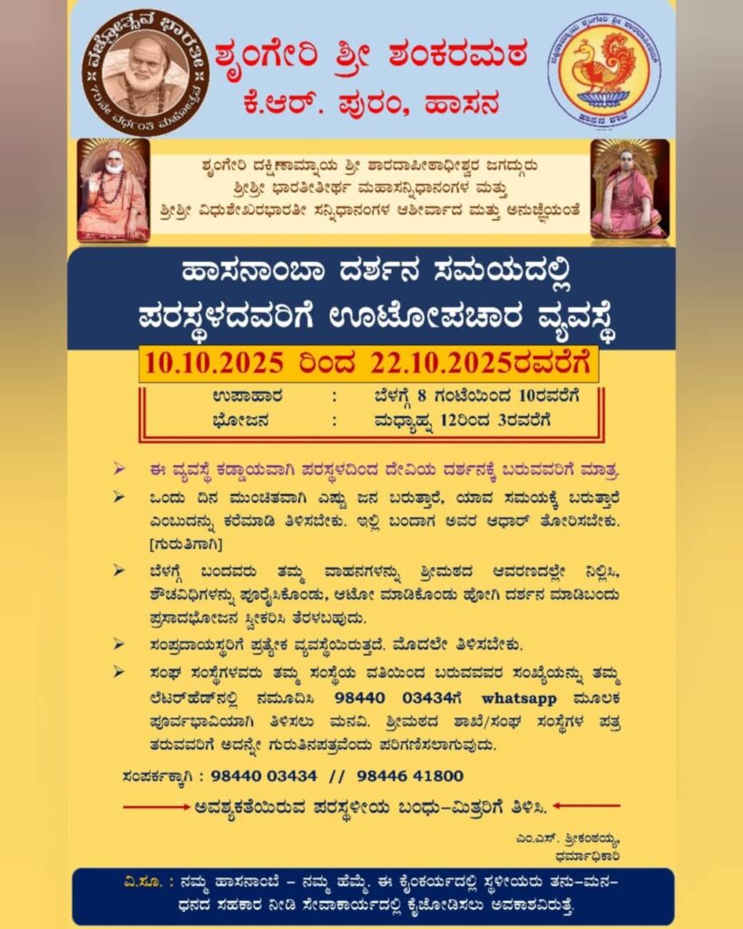 ಹೌದು.. ಹಾಗೆ ಹಾಸನಂಬ ದರ್ಶನ ಸಮಯದಲ್ಲಿ ಪರಸ್ಥಳದವರಿಗೆ ಊಟದ ಉಪಚಾರ ವ್ಯವಸ್ಥೆಯನ್ನು ಶೃಂಗೇರಿ ಶ್ರೀ ಶಂಕರ ಮಠ ಕೆಆರ್‌ ಪುರಂ ಹಾಸನ ಇವರ ವತಿಯಿಂದ ಅಕ್ಟೋಬರ್ 10 ರಿಂದ 22 ರವರೆಗೆ ಭೋಜನ ಉಪಹಾರದ ವ್ಯವಸ್ಥೆಯನ್ನು ಕೈಗೊಂಡಿರುತ್ತಾರೆ.