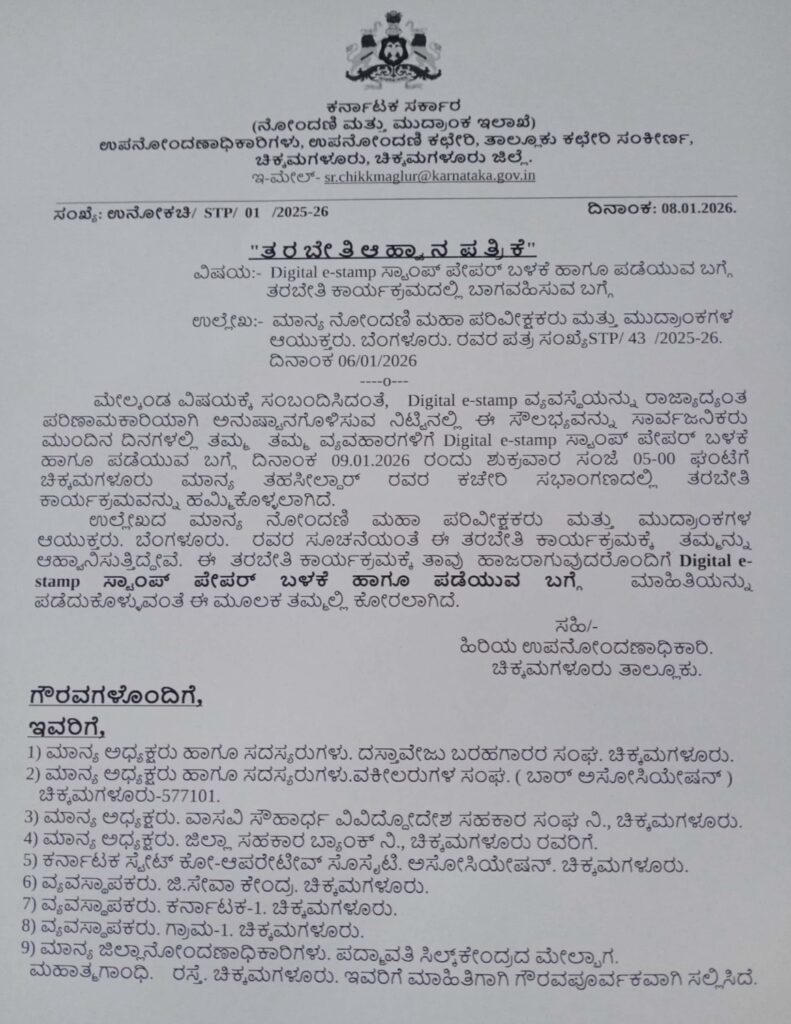 ಚಿಕ್ಕಮಗಳೂರು: ಜಿಲ್ಲೆಯಲ್ಲಿ ಡಿಜಿಟಲ್ ಇ-ಸ್ಟಾಂಪ್ (Digital e-stamp) ವ್ಯವಸ್ಥೆಯನ್ನು ಪರಿಣಾಮಕಾರಿಯಾಗಿ ಜಾರಿಗೆ ತರುವ ನಿಟ್ಟಿನಲ್ಲಿ ಸಾರ್ವಜನಿಕರಿಗೆ ಮತ್ತು ಸಂಬಂಧಪಟ್ಟ ಸಂಘ ಸಂಸ್ಥೆಗಳಿಗೆ ಶುಕ್ರವಾರ ವಿಶೇಷ ತರಬೇತಿ ಕಾರ್ಯಕ್ರಮವನ್ನು ಆಯೋಜಿಸಲಾಗಿದೆ. ಕರ್ನಾಟಕ ಸರ್ಕಾರದ ನೋಂದಣಿ ಮತ್ತು ಮುದ್ರಾಂಕ ಇಲಾಖೆಯ ವತಿಯಿಂದ ಈ ತರಬೇತಿ ನಡೆಯಲಿದ್ದು, ಡಿಜಿಟಲ್ ಇ-ಸ್ಟಾಂಪ್ ಪೇಪರ್ ಪಡೆಯುವ ಮತ್ತು ಬಳಸುವ ವಿಧಾನದ ಬಗ್ಗೆ ಸಂಪೂರ್ಣ ಮಾಹಿತಿ ನೀಡಲಾಗುವುದು.