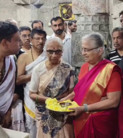 ಬೆಂಗಳೂರಿನಿಂದ ಕುಟುಂಬಸ್ಥರೊಂದಿಗೆ ಧರ್ಮಸ್ಥಳಕ್ಕೆ ತೆರಳುವ ಮಾರ್ಗ ಮಧ್ಯೆ ದೇವಾಲಯಗಳಿಗೆ ಭೇಟಿ ನೀಡಿದ್ದರು. ನೆಲದ ಮೇಲೆ ಕುಳಿತು ಸಂಕಲ್ಪ, ಅರ್ಚನೆ ಮಾಡಿಸಿದರು. ಸುಧಾಮೂರ್ತಿ ಅವರಿಗೆ ಮಹಿಳೆಯರು ಬಾಗಿನ ನೀಡಿದರು. ಪೂಜೆ ಬಳಿಕ ಧರ್ಮಸ್ಥಳಕ್ಕೆ ತೆರಳಿದರು.