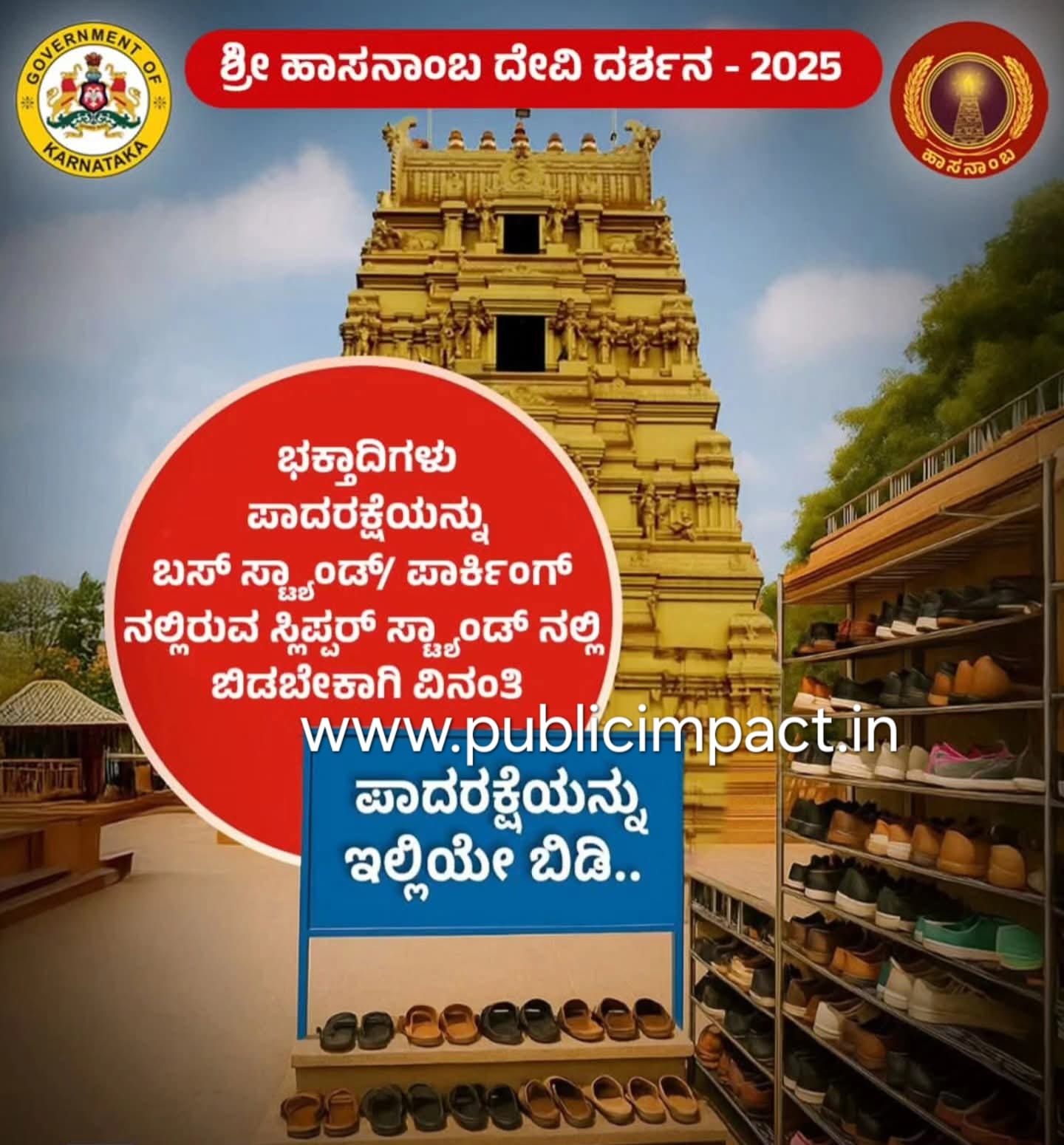 ಹಾಸನಾಂಬ ದೇವಾಲಯದ ಪವಿತ್ರ ಪ್ರಾಂಗಣದಲ್ಲಿ ಇಡುವ ಪ್ರತಿಯೊಂದು ಹೆಜ್ಜೆಯೂ ದೇವಿಯ ಸಮೀಪ ಸಾಗಲು ಇಡುವ ಹೆಜ್ಜೆ. ಹಾಗಾಗಿ ಚಪ್ಪಲಿ ಹಾಗೂ ಪಾದರಕ್ಷೆಗಳನ್ನು ಬಸ್ಸ್ಟ್ಯಾಂಡ್ / ಪಾರ್ಕಿಂಗ್ನಲ್ಲಿರುವ ನಿಗದಿತ ಸ್ಟ್ಯಾಂಡ್ಗಳಲ್ಲಿ ಇಡಬೇಕು. ಇದು ಕೇವಲ ನಿಯಮವಲ್ಲ — ನಮ್ಮ ದೇವಿಗೆ ಸಲ್ಲಿಸುವ ಗೌರವ ಹಾಗೂ ದೇವಾಲಯದ ಪಾವಿತ್ರ್ಯತೆಯನ್ನು ಕಾಪಾಡುವ ನಮ್ಮ ಸಂಪ್ರದಾಯ ಎಂದು ಹಾಸನ ಜಿಲ್ಲಾಡಳಿತದಿಂದ ಪ್ರಕಟಣೆ ಹೊರಡಿಸಲಾಗಿದೆ.