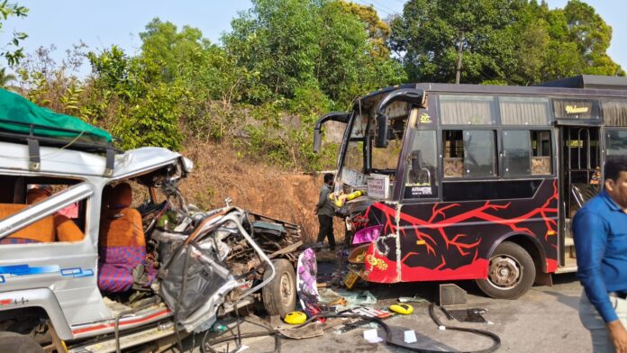 ಉಡುಪಿ: ಖಾಸಗಿ ಬಸ್ ಮತ್ತು ತುಫಾನ್ ವಾಹನದ ನಡುವೆ ಸಂಭವಿಸಿದ ಭೀಕರ ಅಪಘಾತದಲ್ಲಿ ಮೂವರು ಸ್ಥಳದಲ್ಲೇ ಮೃತಪಟ್ಟಿದ್ದು, ಆರು ಮಂದಿ ಗಂಭೀರವಾಗಿ ಗಾಯಗೊಂಡಿರುವ ಘಟನೆ ಕಾರ್ಕಳ ತಾಲೂಕಿನ ಮಿಯಾರು ಕಂಬಳಕ್ರಾಸ್ ಬಳಿ ಶುಕ್ರವಾರ ಮಧ್ಯಾಹ್ನ ನಡೆದಿದೆ.