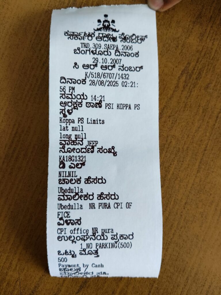 ಹೌದು …ನೋ ಪಾರ್ಕಿಂಗ್‌ ಸ್ಥಳದಲ್ಲಿ ಪೊಲೀಸ್ ವಾಹನವನ್ನು ನಿಲ್ಲಿಸಿ ಹೋಟೆಲ್‌ʼಗೆ ಉಟಕ್ಕೆ ತೆರಳಿದ್ದರು.ಆಗ ಕೊಪ್ಪ ಠಾಣೆಯ ಪಿ ಎಸ್ ಐ ಬಸವರಾಜ್ ವಾಹನಕ್ಕೆ 500 ರೂ. ದಂಡ ವಿಧಿಸಿದ್ದರು.‌