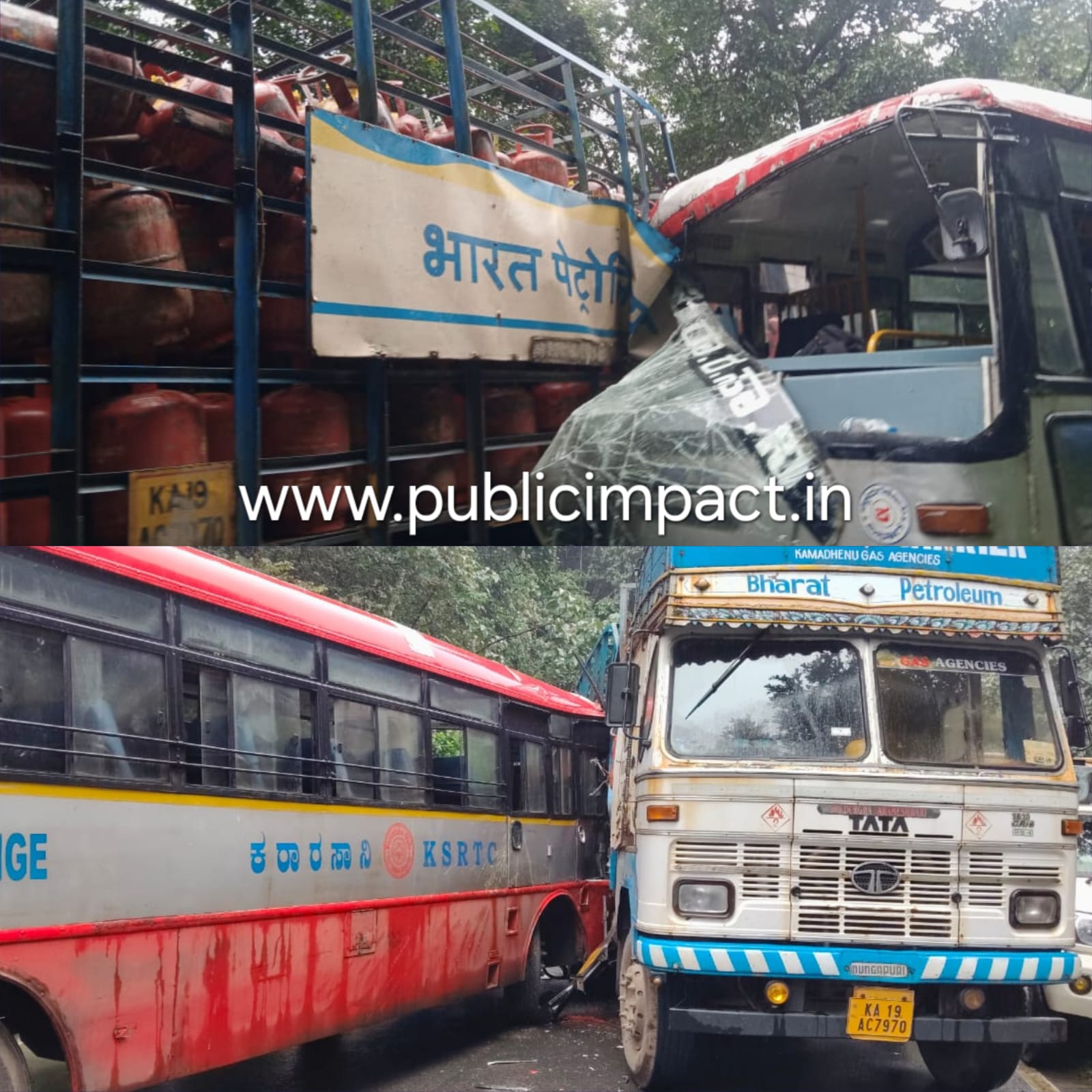 ಪ್ರಾಥಮಿಕ ಮಾಹಿತಿಯಂತೆ, KSRTC ಬಸ್ ಗ್ಯಾಸ್ ಸಿಲಿಂಡರ್ ಹೊತ್ತಿದ್ದ ಲಾರಿಗೆ ನೇರವಾಗಿ ಡಿಕ್ಕಿ ಹೊಡೆದಿದೆ. ತಕ್ಷಣವೇ ಹಿಂಬದಿಯಿಂದ ಮತ್ತೊಂದು ಲಾರಿ ಗ್ಯಾಸ್ ಲಾರಿಗೆ ಡಿಕ್ಕಿ ಹೊಡೆದ ಪರಿಣಾಮ ಅಪಘಾತ ತೀವ್ರಗೊಂಡಿದೆ. ಇದರಲ್ಲಿ KSRTC ಬಸ್ ಚಾಲಕ ಗಂಭೀರವಾಗಿ ಗಾಯಗೊಂಡಿದ್ದು, ಆಸ್ಪತ್ರೆಗೆ ಸಾಗಿಸಲಾಗಿದೆ.