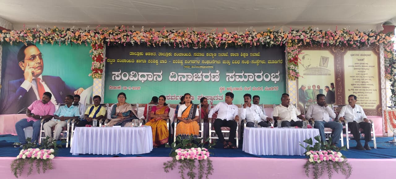 ಮೂಡಿಗೆರೆ: ತಾಲೂಕು ಆಡಳಿತ ಮತ್ತು ತಾಲೂಕು ಪಂಚಾಯಿತಿ ಹಾಗೂ ಸಮಾಜ ಕಲ್ಯಾಣ ಇಲಾಖೆ ವಿವಿಧ ಸಂಘ ಸಂಘ ಸಂಸ್ಥೆಗಳ ಸಂಯುಕ್ತ ಆಶ್ರಯದಲ್ಲಿ ಸಂವಿಧಾನ ದಿನಾಚರಣೆ ಕಾರ್ಯಕ್ರಮವನ್ನು ಪಟ್ಟಣದ ಅಡ್ಯಾಂತಯ ರಂಗಮಂದಿರದಲ್ಲಿ ಅಪಾರ ಗೌರವದೊಂದಿಗೆ ಸಂವಿಧಾನ ಶಿಲ್ಪಿ ಅಂಬೇಡ್ಕರ್ ಅವರ ಭಾವಚಿತ್ರಕ್ಕೆ ಪುಷ್ಪಾರ್ಚನೆ ಸಲ್ಲಿಸಿ ಅದ್ದೂರಿಯಾಗಿ ಆಚರಿಸಲಾಯಿತು