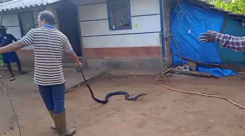 ಕೊನೆಗೂ ಸೆರೆ ಹಿಡಿದ 8 ಅಡಿ ಉದ್ದದ ಕಾಳಿಂಗ ಸರ್ಪವನ್ನ ಅರಣ್ಯ ಇಲಾಖೆ ಸಿಬ್ಬಂದಿ ಎದುರು ಅರಣ್ಯಕ್ಕೆ ಬಿಡಲಾಯಿತು