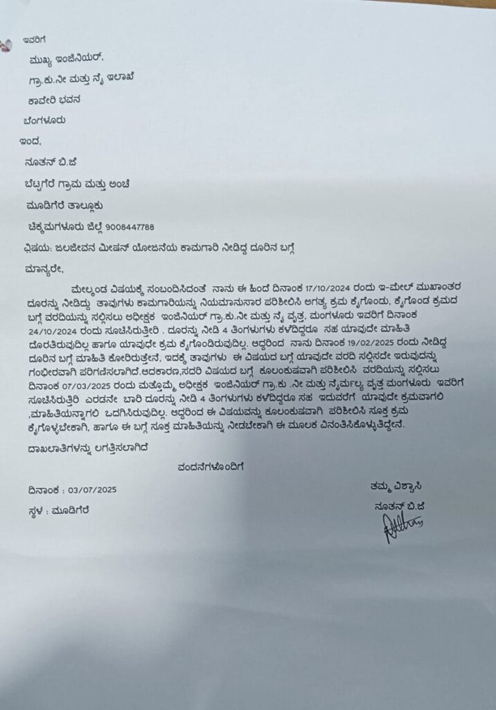 ಈ ಕುರಿತು ಸುದ್ದಿಗಾರರೊಂದಿಗೆ ಮಾತನಾಡಿದ ಅವರು ಕಳೆದ 10 ತಿಂಗಳುಗಳಿಂದ ಚಿಕ್ಕಮಗಳೂರು ಜಿಲ್ಲೆ ಮೂಡಿಗೆರೆ ತಾಲ್ಲೂಕಿನ ಬೆಟ್ಟಗೆರೆ ಗ್ರಾಮದಲ್ಲಿ ಜಲ-ಜೀವನ್-ಮಿಷನ್ ಯೋಜನೆಯಲ್ಲಿ ನಡೆದಿರುವ ಕಾಮಗಾರಿಯ ಕುರಿತು ಮುಖ್ಯ ಇಂಜಿನಿಯರ್ ಗ್ರಾ.ಕು.ನೀ & ನೈರ್ಮಲ್ಯ ವೃತ್ತ , ಕಾವೇರಿ ಭವನ, ಬೆಂಗಳೂರು ಇವರಿಗೆ ದೂರನ್ನು ನೀಡಿದ್ದು,ಅವರು ಅಧೀಕ್ಷಕ ಇಂಜಿನಿಯರ್ ಮಂಗಳೂರು ವೃತ್ತ ಇವರಿಗೆ ಸದರಿ ದೂರಿನ ಕುರಿತು ನಿಯಮಾನುಸಾರ ಪರಿಶೀಲಿಸಿ ಅಗತ್ಯ ಕ್ರಮ ಕೈಗೊಂಡು, ನಂತರ ಕ್ರಮದ ವರದಿಯನ್ನು ಸಲ್ಲಿಸಲು ಸೂಚಿಸಿದ್ದರು ಸಹ, ದೂರನ್ನು ನೀಡಿ 4 ತಿಂಗಳು ಕಳೆದರೂ ಸಹ ಯಾವುದೇ ಮಾಹಿತಿ ದೊರೆತಿರುವುದಿಲ್ಲ ಎಂದು ಅಸಮಾಧಾನ ಹೊರ ಹಾಕಿದರು,
