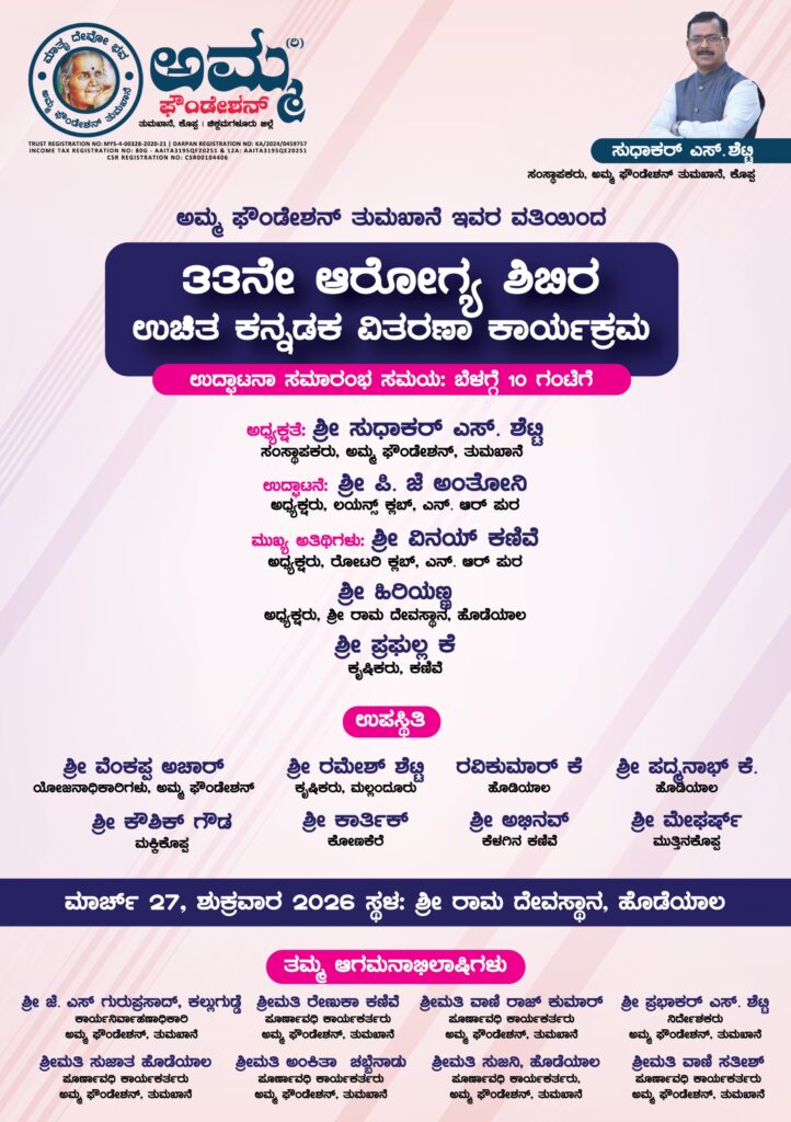 ಎನ್. ಆರ್.ಪುರ:‌ ಮಾರ್ಚ್ 27ರಂದು ಅಮ್ಮ ಫೌಂಡೇಶನ್ ವತಿಯಿಂದ 33ನೇ ಆರೋಗ್ಯ ಶಿಬಿರ ಆಯೋಜನೆ!