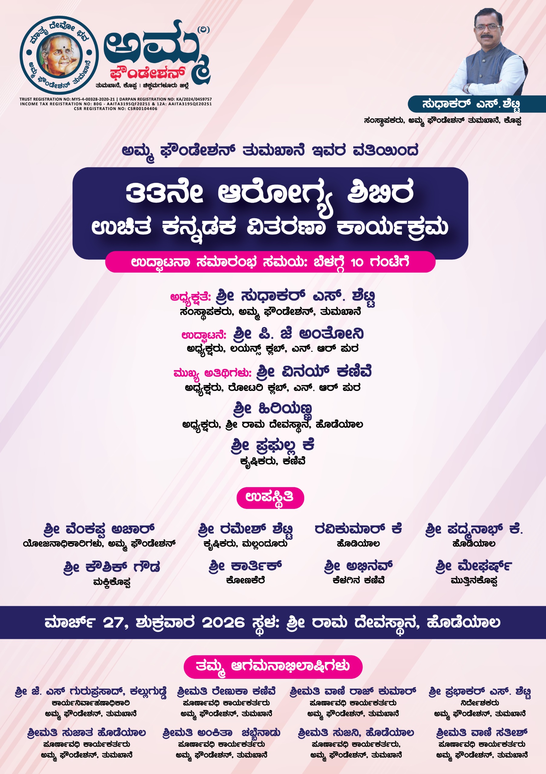 ಹೌದು .. ಮಾರ್ಚ್ 27 ಶುಕ್ರವಾರದಂದು ಹೊಡೆಯಾಲದ ಶ್ರೀರಾಮ ದೇವಸ್ಥಾನದಲ್ಲಿ ಆರೋಗ್ಯ ಶಿಬಿರ ಕಾರ್ಯಕ್ರಮ ಹಮ್ಮಿಕೊಂಡಿದ್ದು ಅಮ್ಮ ಫೌಂಡೇಶನ್ ಸಂಸ್ಥಾಪಕರಾದ ಸುಧಾಕರ್ ಶೆಟ್ಟಿ ಅವರು ಅಧ್ಯಕ್ಷತೆ ವಹಿಸಲಿದ್ದಾರೆ