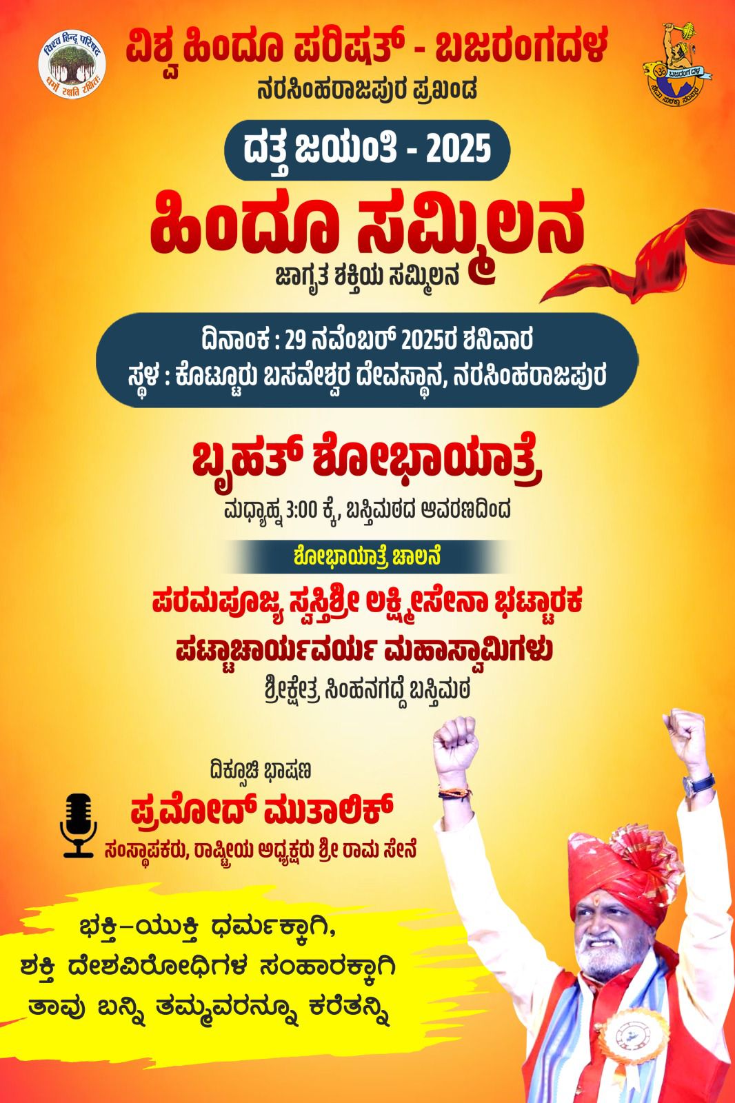 ಶೋಭಾ ಯಾತ್ರೆ ಬಸ್ತಿಮಠದಿಂದ ಹೊರಟು ಪ್ರವಾಸಿ ಮಂದಿರ ತಲುಪಿ ಅಂತರ ಘಟ್ಟಮ್ಮ ದೇವಸ್ಥಾನದ ಮಾರ್ಗವಾಗಿ ಕೊಟ್ಟೂರು ಬಸವೇಶ್ವರ ದೇವಸ್ಥಾನದ ಆವರಣಕ್ಕೆ ಬರಲಿದೆ. ಅಲ್ಲಿ ಸಂಜೆ 6 ಗಂಟೆಗೆ ಹಿಂದೂ ಸಮ್ಮಿಲನ ಕಾರ್ಯಕ್ರಮ ನಡೆಯಲಿದೆ. ದಿಕ್ಕೂಚಿ ಭಾಷಣಕಾರರಾಗಿ ಶ್ರೀ ರಾಮಸೇನೆ ಸಂಸ್ಥಾಪಕ ಹಾಗೂ ರಾಷ್ಟ್ರೀಯ ಅಧ್ಯಕ್ಷ ಪ್ರಮೋದ್ ಮುತಾಲಿಕ್ ದಿಕ್ಕೂಚಿ ಭಾಷಣ ಮಾಡಲಿದ್ದಾರೆ. ಸಭೆಯಲ್ಲಿ ವಿಶ್ವ ಹಿಂದೂ ಪರಿಷತ್ ಜಿಲ್ಲಾಧ್ಯಕ್ಷ ಕೆ.ಪಿ.ಸುರೇಶ್ ಕುಮಾರ್ ಮತ್ತಿತರ ಮುಖಂಡರು ಭಾಗವಹಿಸಲಿದ್ದಾರೆ. ಮಂಡಗದ್ದೆ ಸರ್ಕಲ್ ನ ಈಶ್ವರ ದೇವಸ್ಥಾನದಲ್ಲಿ ದತ್ತ ಮಾಲಾಧಾರಣೆಗೆ ಚಾಲನೆ ನೀಡಲಾಗಿದೆ. ತಾಲೂಕಿನ ವಿವಿಧ ದೇವಸ್ಥಾನಗಳಲ್ಲಿ ದತ್ತ ಮಾಲೆ ಅಭಿಯಾನ ಪ್ರಾರಂಭವಾಗಿದೆ ಎಂದು ತಿಳಿಸಲಾಗಿದೆ.