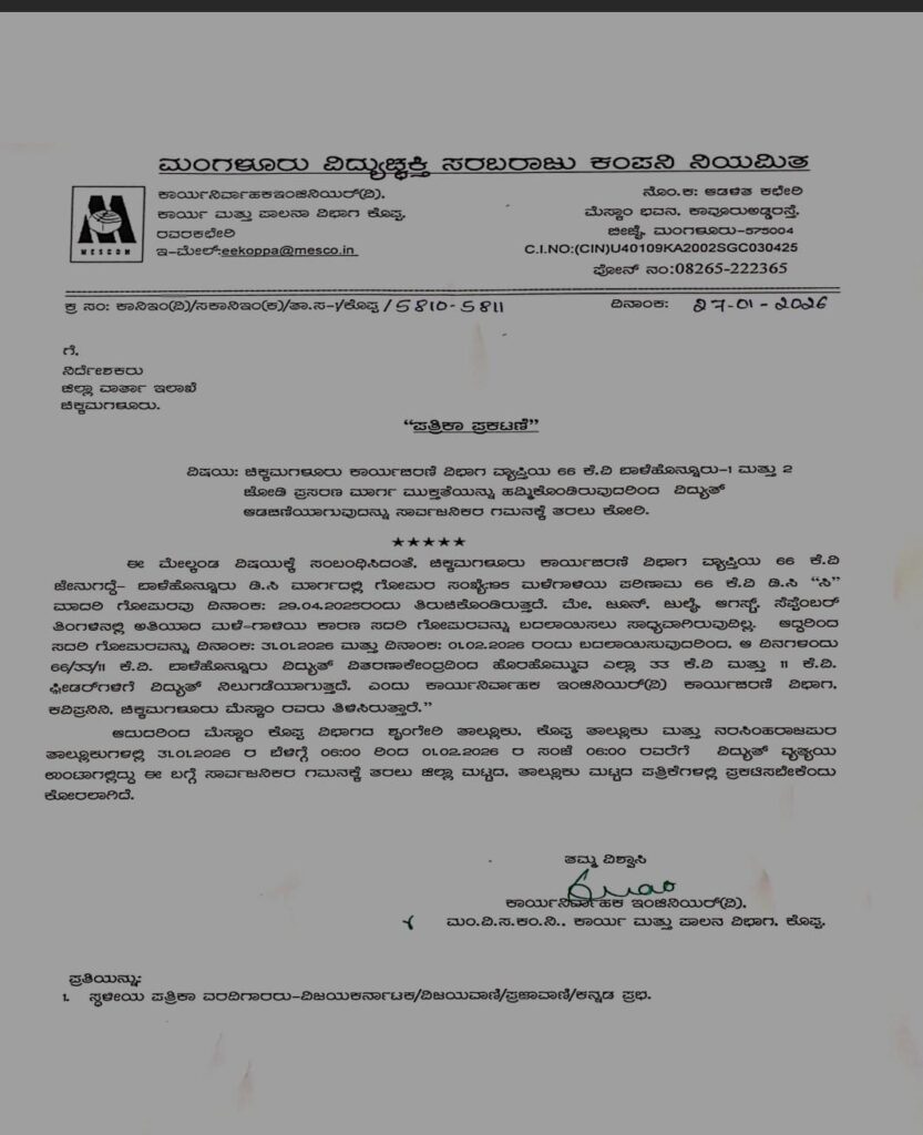 ಹೀಗಾಗಿ ಶೃಂಗೇರಿ ತಾಲ್ಲೂಕು, ಕೊಪ್ಪ ತಾಲ್ಲೂಕು ಹಾಗೂ ನರಸಿಂಹರಾಜಪುರ ತಾಲ್ಲೂಕುಗಳಲ್ಲಿ 2026ರ ಜನವರಿ 31ರ ಬೆಳಿಗ್ಗೆ 6 ಗಂಟೆಯಿಂದ ಫೆಬ್ರವರಿ 1ರ ಸಂಜೆ 6 ಗಂಟೆಯವರೆಗೆ ವಿದ್ಯುತ್ ವ್ಯತ್ಯಯ ಉಂಟಾಗಲಿದೆ ಎಂದು ಪತ್ರಿಕಾ ಪ್ರಕಟಣೆ ಮೂಲಕ ತಿಳಿಸಿದೆ.