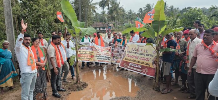 ಸಕಲೇಶಪುರ/ ಆಲೂರು: ಗುಂಡಿಗಳಲ್ಲಿ ಬಾಳೆಗಿಡಗಳನ್ನ ನೆಟ್ಟು ರಾಜ್ಯ ಸರ್ಕಾರದ ವಿರುದ್ಧ ಹಾಸನ ಜಿಲ್ಲೆಯ ಸಕಲೇಶಪುರ-ಆಲೂರು ತಾಲೂಕುಗಳಲ್ಲಿ ಆಕ್ರೋಶ ವ್ಯಕ್ತಪಡಿಸಲಾಯ್ತು. ಶಾಸಕ ಸಿಮೆಂಟ್ ಮಂಜು ನೇತೃತ್ವದಲ್ಲಿ ನಡೆದ ಪ್ರತಿಭಟನೆಯಲ್ಲಿ ಚಿನ್ನಳ್ಳಿ-ಅಬ್ಬನ ಗ್ರಾಮದಲ್ಲಿ ಪ್ರತಿಭಟನಾಕಾರರು ಕಿಡಿ ಕಾರಿದರು.