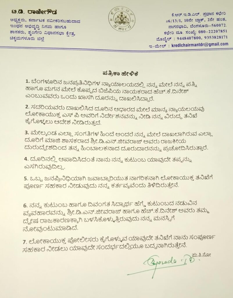ಶೃಂಗೇರಿ ಕ್ಷೇತ್ರದ ಶಾಸಕರಾದ ಟಿ.ಡಿ.ರಾಜೇಗೌಡ ಮತ್ತು ಅವರ ಕುಟುಂಬದ ಮೇಲೆ ಬಂದಿರುವಅಕ್ರಮ ಆಸ್ತಿ ಗಳಿಸಿದ ಆರೋಪದ ಕುರಿತು ಶಾಸಕರು ತಮ್ಮ ಪತ್ರಿಕಾ ಹೇಳಿಕೆ ಮೂಲಕ ಸ್ಪಷ್ಟೀಕರಣ ನೀಡಿದ್ದಾರೆ
