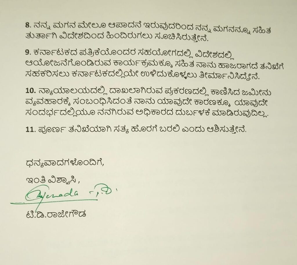 9.ಕರ್ನಾಟಕದ ಪತ್ರಿಕೆಯೊಂದರ ಸಹಯೋಗದಲ್ಲಿ ವಿದೇಶದಲ್ಲಿ ಆಯೋಜನೆಗೊಂಡಿರುವ ಕಾರ್ಯಕ್ರಮಕ್ಕೂ ಸಹಿತ ನಾನು ಹಾಜರಾಗದೆ ತನಿಖೆಗೆ ಸಹಕರಿಸಲು ಕರ್ನಾಟಕದಲ್ಲಿಯೇ ಉಳಿದುಕೊಳ್ಳಲು ತೀರ್ಮಾನಿಸಿದ್ದೇನೆ..