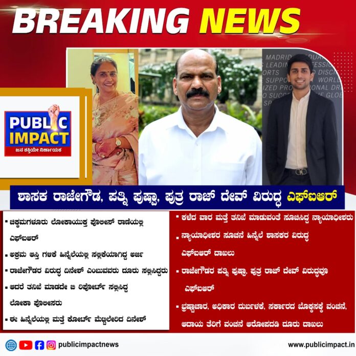 ಚಿಕ್ಕಮಗಳೂರು: ಶೃಂಗೇರಿ ಶಾಸಕ ಟಿ.ಡಿ ರಾಜೇಗೌಡ ಅವರ ಪತ್ನಿ ಪುಷ್ಪ ಹಾಗೂ ಪುತ್ರ ಅರ್ಪಿತ್ ರಾಜ್ ದೇವ್ ವಿರುದ್ಧ ಲೋಕಾಯುಕ್ತದಲ್ಲಿ ಎಫ್ ಐಆರ್ ದಾಖಲಾಗಿದೆ. ಚಿಕ್ಕಮಗಳೂರು ಮತ್ತು ಹಾಸನ ಲೋಕಾಯುಕ್ತ ಎಸ್ಪಿ ಕಚೇರಿ ಜನಪ್ರತಿನಿಧಿಗಳ ನ್ಯಾಯಾಲಯದ ಆದೇಶದ ಮೇರೆಗೆ ಎಫ್ ಐಆರ್ ದಾಖಲಾಗಿದ್ದು ತನಿಖೆ ನಡೆಸುವಂತೆ ಲೋಕಾಯುಕ್ತ ಪೊಲೀಸರಿಗೆ ಸೂಚನೆ ನೀಡಲಾಗಿದೆ