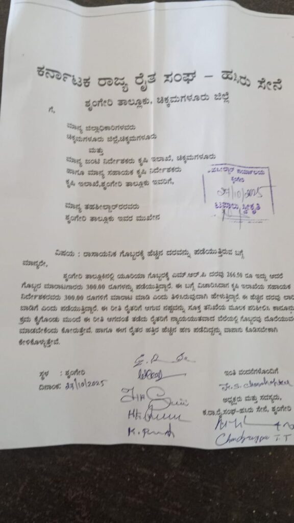 ಹೌದು .. ಶೃಂಗೇರಿ ತಾಲೂಕಿನ ತಹಸೀಲ್ದಾರ್‌ ಅವರ ಮುಖಾಂತರ ಚಿಕ್ಕಮಗಳೂರು ಜಂಟಿ ಕೃಷಿ ನಿರ್ದೇಶಕರಿಗೆ ಮನವಿ ಪತ್ರ ಸಲ್ಲಿಸಿದ್ದು, ಯೂರಿಯಾ ಗೊಬ್ಬರ 266.50 ಆದರೆ ಗೊಬ್ಬರ ಮಾರಾಟಗಾರರು 300 ರೂ. ಗಳಿಗೆ ಮಾರಾಟ ಮಾಡಿದ್ದಾರೆ.