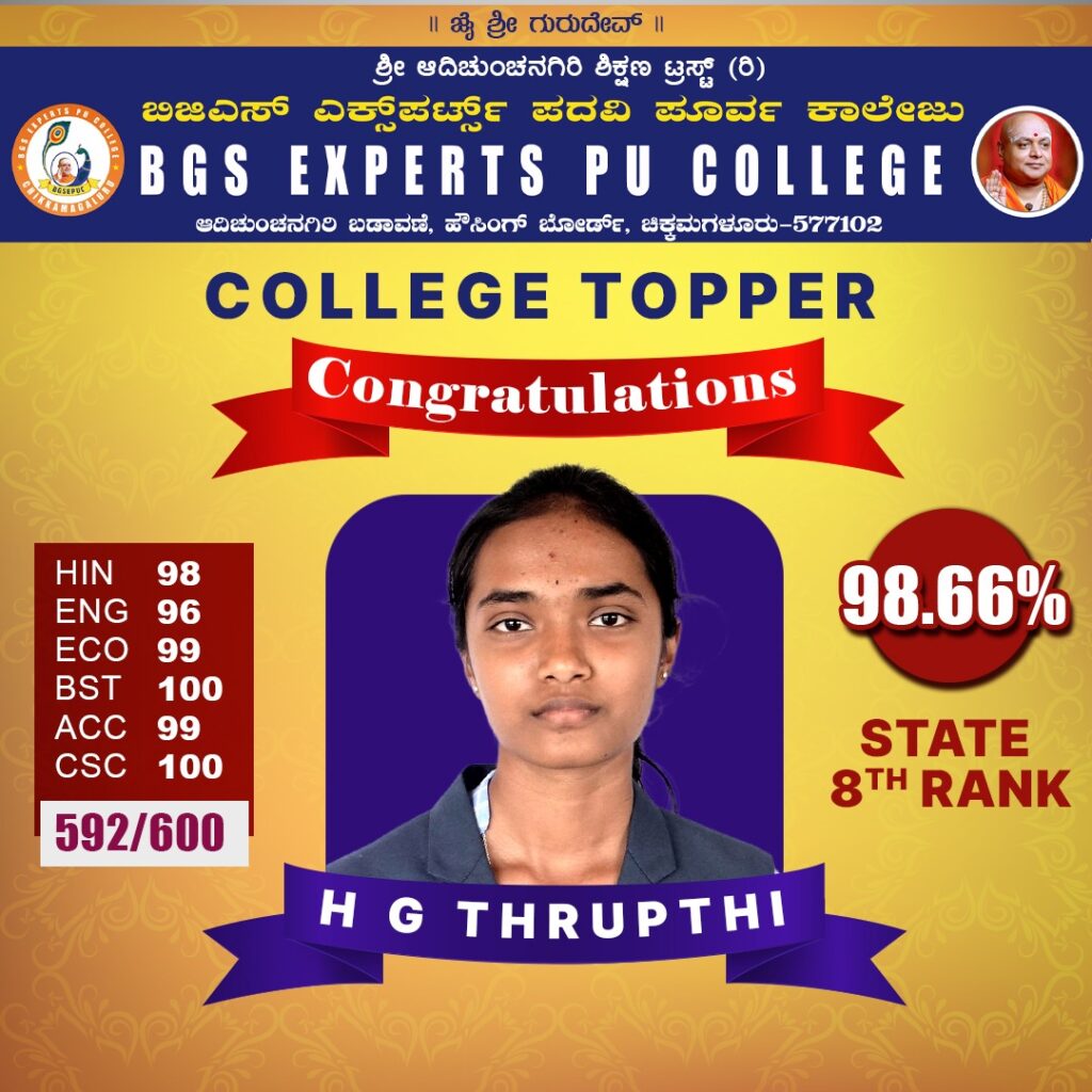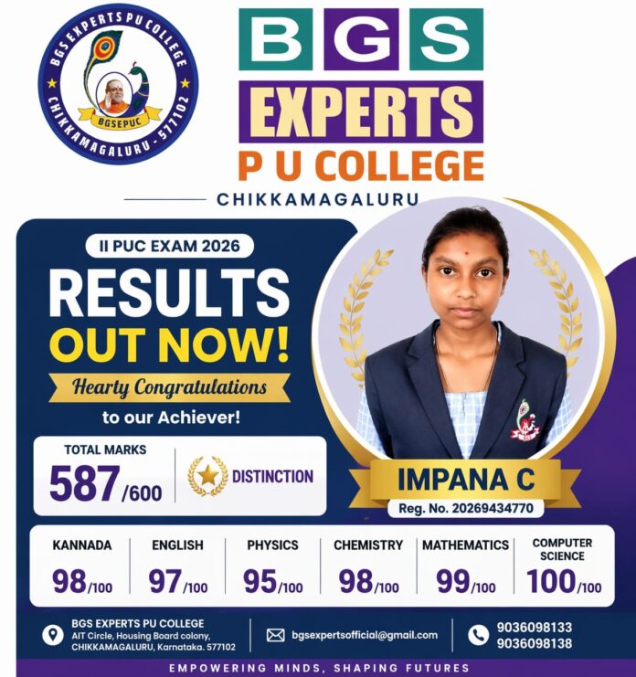 2025–26ನೇ ಸಾಲಿನ ದ್ವಿತೀಯ ಪಿಯುಸಿ ಫಲಿತಾಂಶ ಪ್ರಕಟವಾಗಿದ್ದು ಚಿಕ್ಕಮಗಳೂರಿನ ಬಿ.ಜಿ.ಎಸ್ ಎಕ್ಸ್ಪರ್ಟ್ಸ್ ಪದವಿಪೂರ್ವ ಕಾಲೇಜಿನ ಇಬ್ಬರು ವಿದ್ಯಾರ್ಥಿಗಳು ಟಾಪರ್ಸ್ ಆಗಿ ಹೊರಹೊಮ್ಮಿದ್ದಾರೆ. ವಿಜ್ಞಾನ ವಿಭಾಗದಲ್ಲಿ ಕುಮಾರಿ ಎಚ್. ಜಿ. ತೃಪ್ತಿ 600ಕ್ಕೆ 592 ಅಂಕ ಹಾಗೆ ವಾಣಿಜ್ಯ ವಿಭಾಗದಿಂದ ಇಂಪನ ಸಿ ಅವರು 600ಕ್ಕೆ 587 ಅಂಕ ಗಳಿಸಿ ಅತ್ಯುತ್ತಮ ಸಾಧನೆ ಮಾಡಿದ್ದಾರೆ.