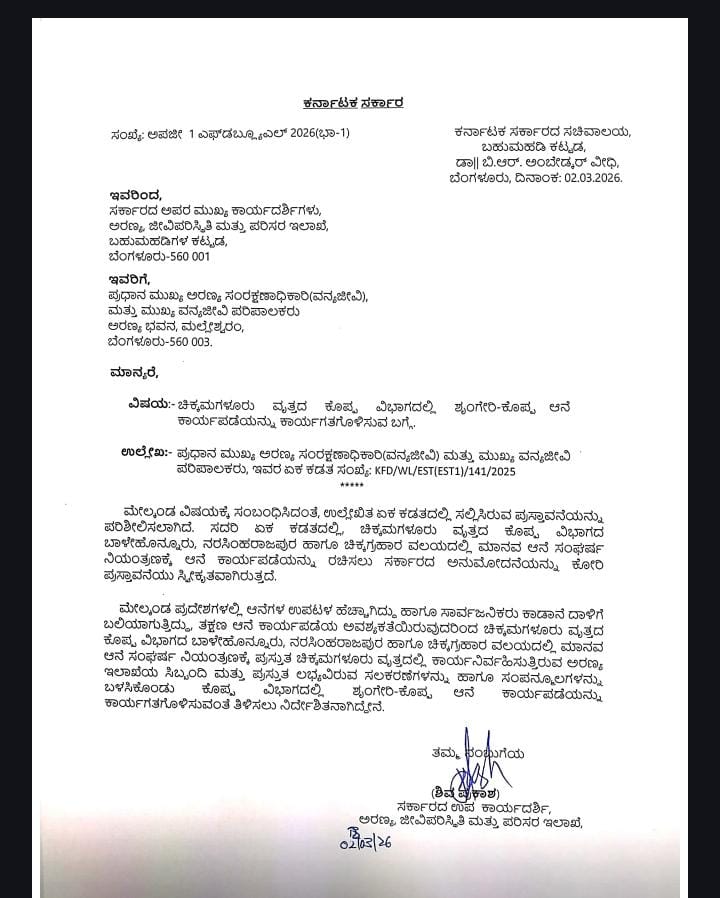 ಕೊಪ್ಪ: ಕಾಡಾನೆ-ಮಾನವ ಸಂಘರ್ಷ ತಡೆಗೆ ಚಿಕ್ಕಮಗಳೂರು ಜಿಲ್ಲೆಯ ಕೊಪ್ಪ ವಿಭಾಗದಲ್ಲಿ ಶೃಂಗೇರಿ-ಕೊಪ್ಪ ಆನೆ ಕಾರ್ಯಪಡೆ ಕಾರ್ಯಗತಗೊಳಿಸಲು ಸರ್ಕಾರ ಆದೇಶ ಜಾರಿ ಮಾಡಿದೆ.