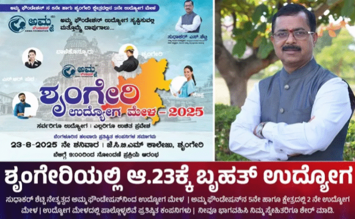 ಶೃಂಗೇರಿಯಲ್ಲಿ ನಾಳೆ ಬೃಹತ್‌ ಉದ್ಯೋಗ ಮೇಳ:ಸುಧಾಕರ ಶೆಟ್ಟಿ ನೇತೃತ್ವದಲ್ಲಿ ಆಯೋಜನೆ!