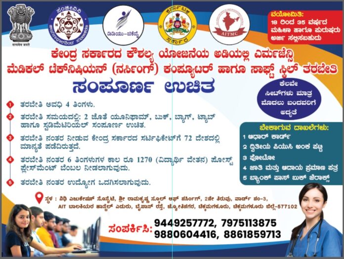 ಕೇಂದ್ರ ಸರ್ಕಾರದ ಕೌಶಲ್ಯ ಯೋಜನೆಯ ಅಡಿಯಲ್ಲಿ ಎಮರ್ಜೆನ್ಸಿ ಮೆಡಿಕಲ್ ಟೆಕ್ ನಿಷಿಯನ್ (ನರ್ಸಿಂಗ್) ಕಂಪ್ಯೂಟರ್ ಹಾಗೂ ಸಾಫ್ಟ್ ಸ್ಕಿಲ್ ತರಬೇತಿ ಸಂಪೂರ್ಣ ಉಚಿತ.!