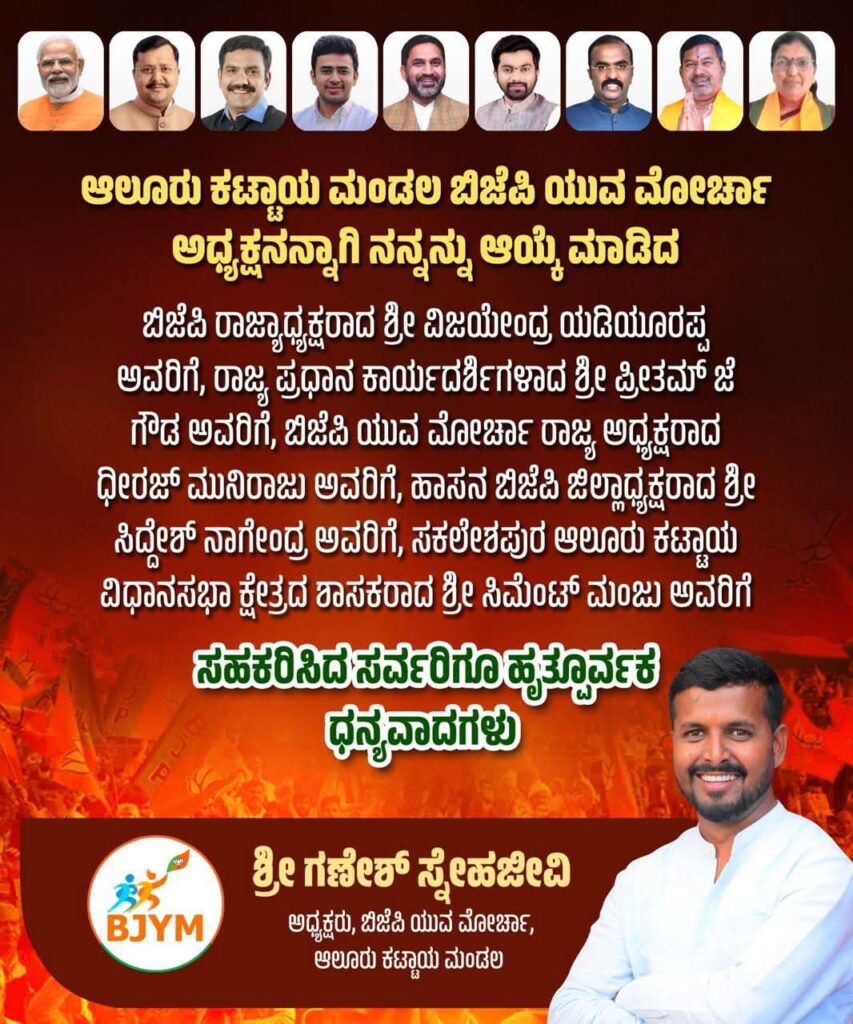 ಇನ್ನೂ ತನ್ನ ಮೇಲೆ ನಂಬಿಕೆಯಿಟ್ಟು ಜವಾಬ್ದಾರಿಯುತ ಸ್ಥಾನ ನೀಡಿದ ಬಿಜೆಪಿ ರಾಜ್ಯಾಧ್ಯಕ್ಷ ವಿಜಯೇಂದ್ರ ಅವರಿಗೂ, ಯುವ ಮೋರ್ಚಾ ರಾಜ್ಯಾಧ್ಯಕ್ಷ ಧೀರಜ್ ಮುನಿರಾಜ್ ಅವರಿಗೂ , ರಾಜ್ಯ ಪ್ರಧಾನ ಕಾರ್ಯದರ್ಶಿ ಪ್ರೀತಮ್ ಗೌಡ ಅವರಿಗೂ, ಹಾಸನ ಬಿಜೆಪಿ ಜಿಲ್ಲಾಧ್ಯಕ್ಷರಾದ ಸಿದ್ದೇಶ್ ನಾಗೇಂದ್ರ ಅವರಿಗೂ , ಸಕಲೇಶಪುರ-ಆಲೂರು-ಕಟ್ಟಾಯ ವಿಧಾನಸಭಾ ಕ್ಷೇತ್ರದ ಶಾಸಕರಾದ ಸಿಮೆಂಟ್ ಮಂಜು ಅವರಿಗೂ ಆಲೂರು-ಕಟ್ಟಾಯ ಮಂಡಲದ ಯುವ ಮೋರ್ಚಾದ ಅಧ್ಯಕ್ಷರಾದ ಶ್ರೀ ಗಣೇಶ್ ಸ್ನೇಹಜೀವಿ ಅವರು ಧನ್ಯವಾದ ಅರ್ಪಿಸಿದ್ದಾರೆ..