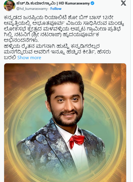 ಎಕ್ಸ್‌ನಲ್ಲಿ ಪೋಸ್ಟ್‌ ಹಂಚಿಕೊಂಡಿರುವ ಹೆಚ್‌ಡಿಕೆ, ಕನ್ನಡದ ಜನಪ್ರಿಯ ರಿಯಾಲಿಟಿ ಶೋ ಬಿಗ್ ಬಾಸ್ 12ನೇ ಆವೃತ್ತಿಯಲ್ಲಿ ಅಭೂತಪೂರ್ವ ವಿಜಯ ಸಾಧಿಸಿರುವ ಮಂಡ್ಯ ಲೋಕಸಭೆ ಕ್ಷೇತ್ರದ ಮಳವಳ್ಳಿಯ ಅಪ್ಪಟ ಗ್ರಾಮೀಣ ಪ್ರತಿಭೆ ಗಿಲ್ಲಿ ನಟನಿಗೆ (ಶ್ರೀ ನಟರಾಜ್) ಹೃದಯಪೂರ್ವಕ ಅಭಿನಂದನೆಗಳು ಎಂದಿದ್ದಾರೆ.
