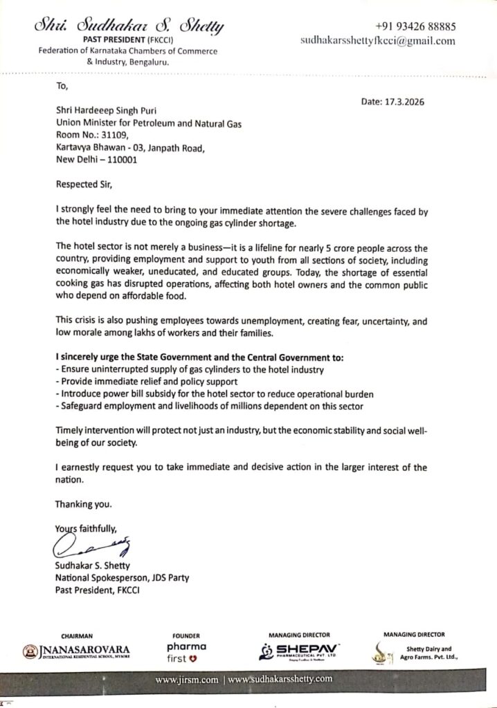 ಹೋಟೆಲ್ ಉದ್ಯಮಕ್ಕೆ ನಿರಂತರ ಗ್ಯಾಸ್ ಸರಬರಾಜು, ತಕ್ಷಣದ ಪರಿಹಾರ ಕ್ರಮಗಳು, ವಿದ್ಯುತ್ ಬಿಲ್ ಸಬ್ಸಿಡಿ ಹಾಗೂ ಉದ್ಯೋಗ ರಕ್ಷಣೆಗಾಗಿ ಸರ್ಕಾರ ತಕ್ಷಣ ಕ್ರಮ ಕೈಗೊಳ್ಳಬೇಕೆಂದು ಅವರು ಮನವಿ ಮಾಡಿದ್ದಾರೆ. ಸಮಯೋಚಿತ ಹಸ್ತಕ್ಷೇಪದ ಮೂಲಕ ಈ ಕ್ಷೇತ್ರವನ್ನು ಉಳಿಸಿ, ಜನರ ಜೀವನಾಧಾರವನ್ನು ಕಾಪಾಡುವಂತೆ ಸರ್ಕಾರವನ್ನು ಒತ್ತಾಯಿಸಿದ್ದಾರೆ