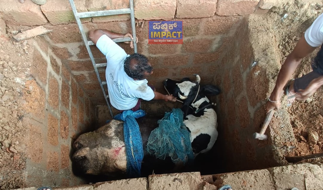 ಗ್ರಾಮದಲ್ಲಿ ನೂತನ ಮನೆ ನಿರ್ಮಾಣಕ್ಕಾಗಿ ಎಂಟು ಅಡಿ ಆಳದ ಸಂಪ್ ನಿರ್ಮಾಣ ಮಾಡಲಾಗಿತ್ತು. ಅದರ ಕೆಲಸ ಪೂರ್ಣಗೊಳ್ಳದ ಹಿನ್ನೆಲೆ ಅಡಿಕೆ ದಬ್ಬೆ ಹಾಕಿ ಮುಚ್ಚಲಾಗಿತ್ತು. ಕೊಟ್ಟಿಗೆಗೆ ಹೋಗಬೇಕಿದ್ದ ಹಸು ಆಕಸ್ಮಿಕವಾಗಿ ಆ ಸಂಪ್ಗೆ ಬಿದ್ದಿದೆ. ಇದನ್ನ ಗಮನಿಸಿದ ಸ್ಥಳೀಯರು ಅಗ್ನಿಶಾಮಕ ದಳಕ್ಕೆ ಮಾಹಿತಿ ನೀಡಿದ್ದಾರೆ. ಸ್ಥಳಕ್ಕಾಗಮಿಸಿದ ಭದ್ರಾವತಿ ಅಗ್ನಿಶಾಮಕ ದಳ ಸಿಬ್ಬಂದಿ ಹಸುವಿಗೆ ಬೆಲ್ಟ್ ಕಟ್ಟಿ ಜೆಸಿಬಿ ಸಹಾಯದಿಂದ ಮೇಲಕ್ಕೆತ್ತಿದ್ದಾರೆ. ಒಂದು ಗಂಟೆಗೂ ಹೆಚ್ಚು ನಡೆದ ಕಾರ್ಯಾಚರಣೆ ನಡೆಸಿ ಹಸುವನ್ನು ಮೇಲೆತ್ತಲಾಗಿದೆ.