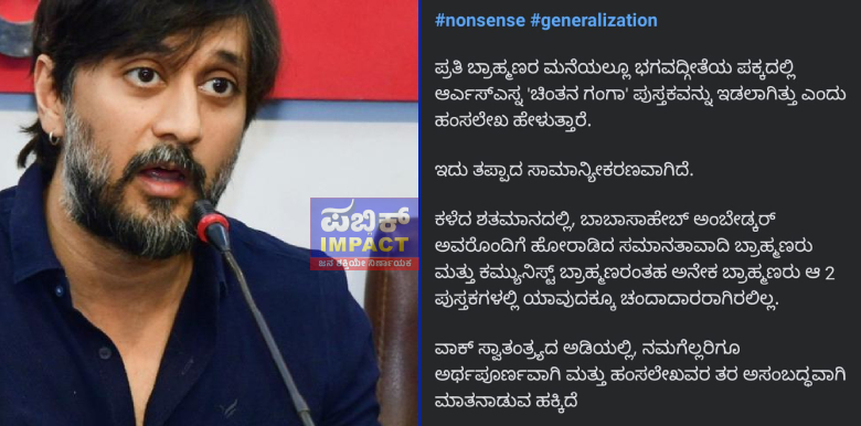 ಪ್ರತಿ ಬ್ರಾಹ್ಮಣರ ಮನೆಯಲ್ಲೂ ಭಗವದ್ಗೀತೆಯ ಪಕ್ಕದಲ್ಲಿ RSSನ ‘ಚಿಂತನ ಗಂಗಾ’ ಪುಸ್ತಕವನ್ನು ಇಡಲಾಗಿತ್ತು ಎಂದು ಹೇಳಿರುವ ಹಂಸಲೇಖ ಅವರ ಹೇಳಿಕೆಯನ್ನು ಖಂಡಿಸಿರುವ ಚೇತನ್, ಅವರದ್ದು ತಪ್ಪು ವ್ಯಾಖ್ಯಾನ. ಕಳೆದ ಶತಮಾನದಲ್ಲಿ, ಬಾಬಾಸಾಹೇಬ್ ಅಂಬೇಡ್ಕರ್ ಅವರೊಂದಿಗೆ ಹೋರಾಡಿದ ಸಮಾನತಾವಾದಿ ಬ್ರಾಹ್ಮಣರು ಮತ್ತು ಕಮ್ಯುನಿಸ್ಟ್ ಬ್ರಾಹ್ಮಣರಂತಹ ಅನೇಕ ಬ್ರಾಹ್ಮಣರು ಆ 2 ಪುಸ್ತಕಗಳಲ್ಲಿ ಯಾವುದಕ್ಕೂ ಚಂದಾದಾರರಾಗಿರಲಿಲ್ಲ ಎಂದಿದ್ದಾರೆ.